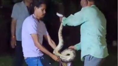 रेस्ट हाउस में घुसा विशाल अजगर: शिकार की तलाश में मचाया हड़कंप, रेस्क्यू के बाद दिखा भयावह रूप, उठाने में लगे दो लोग