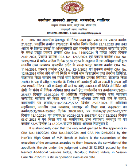 हालांकि आबकारी आयुक्त कार्यालय ने स्पष्ट किया कि सजा निरस्त नहीं की गई है लाइसेंस निलंबन पर कोई रोक नहीं है अधीनस्थ न्यायालय का दोषसिद्धि आदेश यथावत है महाधिवक्ता से प्राप्त अभिमत एवं हाईकोर्ट आदेशों की समीक्षा के बाद यह निष्कर्ष निकाला गया।