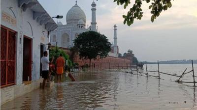 यमुना का जलस्तर बढ़ा: ताजमहल परिसर में टिकट विंडो से बाग तक बाढ़ का पानी भर गया
